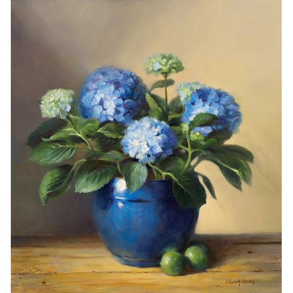 Elizabeth Brandon original oil of Blue Hydrangeas in a Blue Pot with Limes