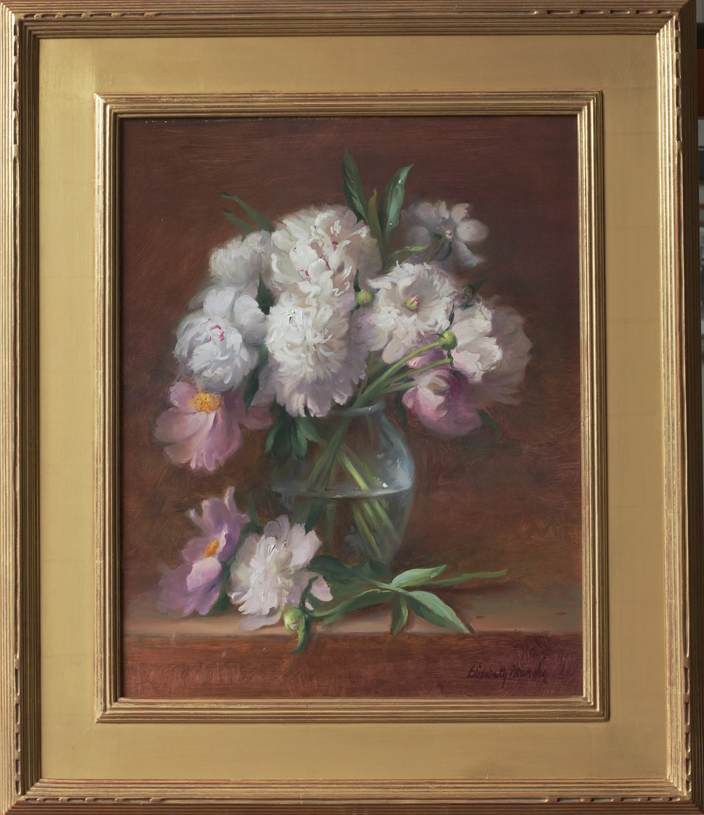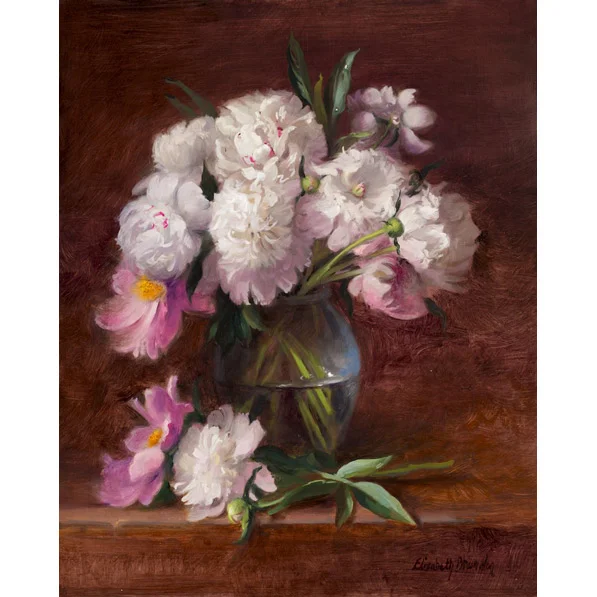 Traditional Floral with Pink and White Peonies in a glass vase with an umber background.